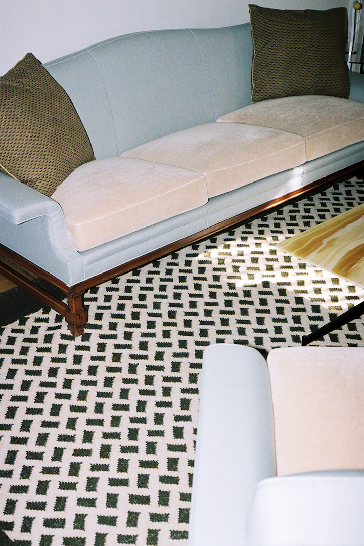 The rugs bear the hallmarks of classic Nordic design; the aesthetic is cool and understated, with pared-back geometric patterns and tonal colour combinations. Memories and images of Sweden are at the heart of the designs. Some pieces, woven in soft greenish-blues, greys and white, recall the hazy light and the gently rolling flatlands of the Swedish landscape. Other rugs feature richer, bolder hues: the deep blues, dusty pinks, lemon yellows and burnt reds that run through the collection are characteristic of the vibrant facades of Stockholm’s well-known 19th-century houses.